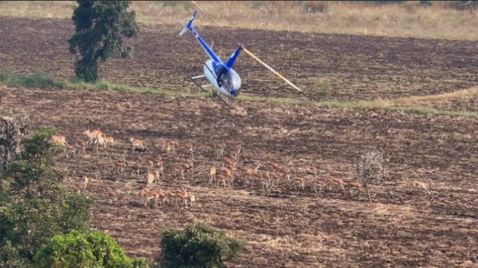 कृष्णमृग और नीलगायों से फसलें बचाने में हेलीकॉप्टर और बोमा तकनीक कारगर साबित हुई। अभियान में दक्षिण अफ्रीका की कंजरवेशन सॉल्यूशंस कंपनी के 15 विशेषज्ञों ने भाग लिया और प्रदेश की वन टीम को प्रशिक्षित किया। रॉबिन्सन-44 हेलीकॉप्टर से पहले खेतों और खुले इलाकों का सर्वे किया गया, फिर रणनीतिक रूप से “बोमा” (घास और जाल से बनी फनल आकार की बाड़) लगाकर जानवरों को सुरक्षित दिशा में ले जाया गया। यह पूरी प्रक्रिया वन्यजीवों को डर या चोट पहुंचाए बिना पूरी की गई।